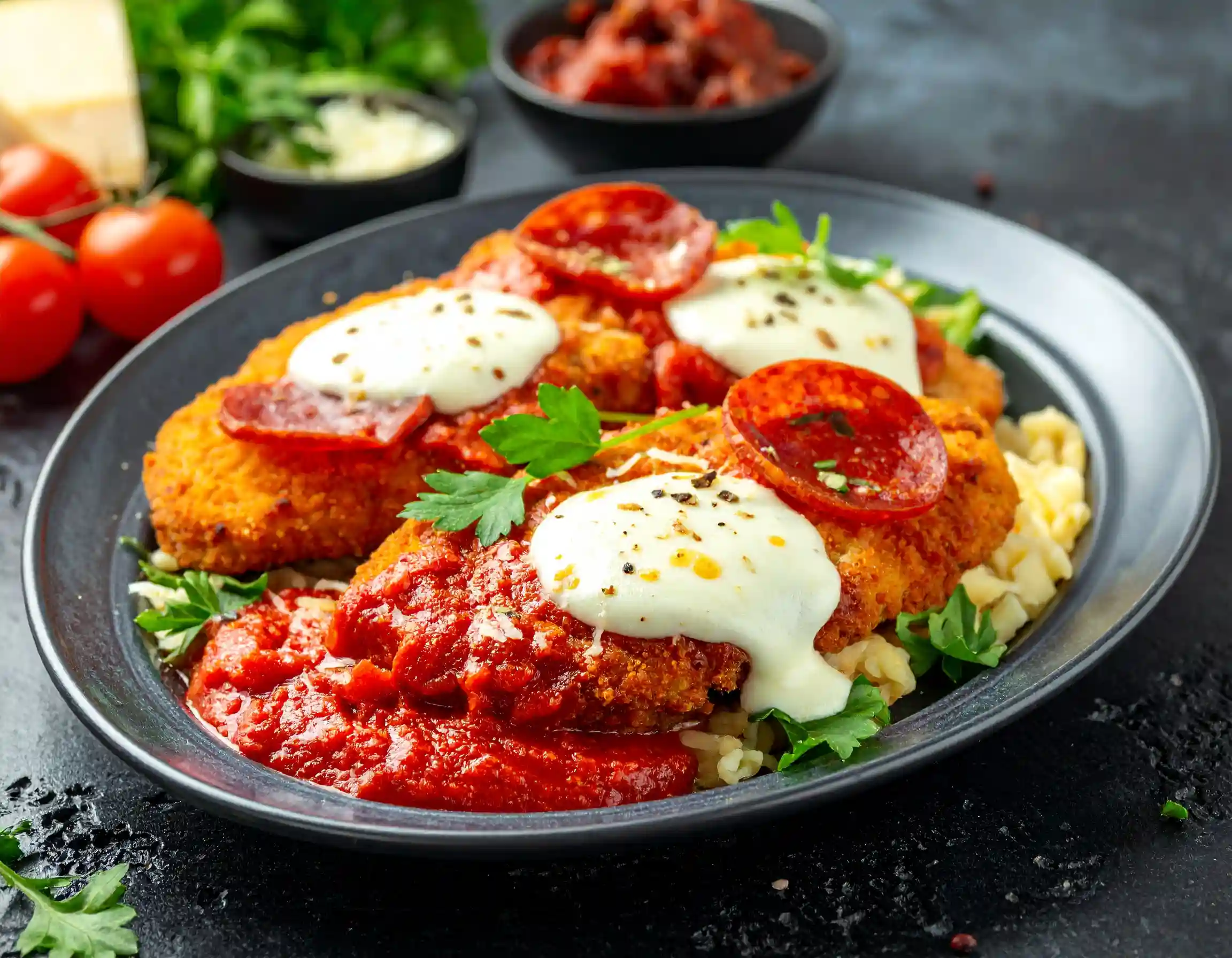 Escalope de poulet, Sauce tomate, Crème, Mozza, Emmental, Pepperoni